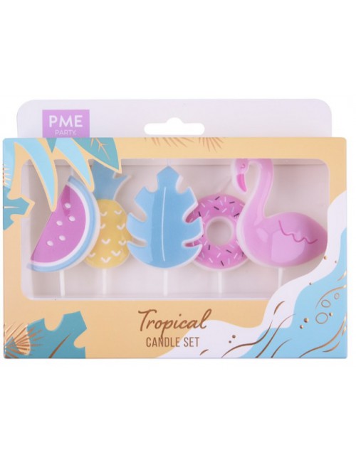 Pack de 5 velas temática tropical: 1x Donut, 1x Piña, 1x Hoja tropical, 1x Flamenco, 1x Sandía