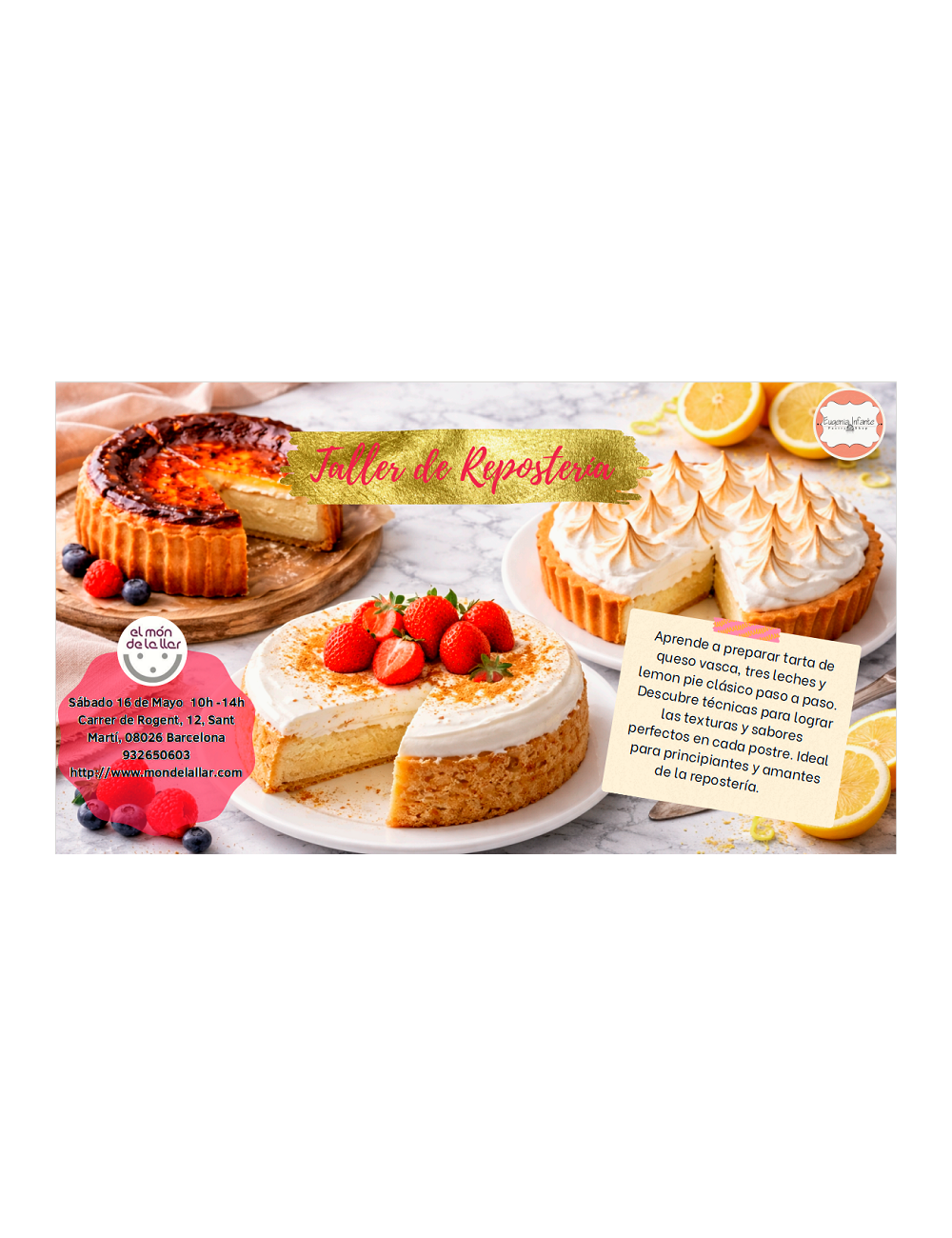En este taller práctico, aprenderás a preparar tres recetas de Tartas Frescas clásicas que no fallan, tres tartas que triunfan en primavera-verano tanto por su sabor como por su textura: